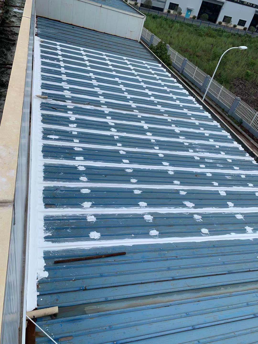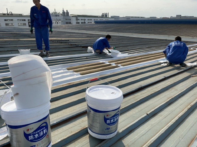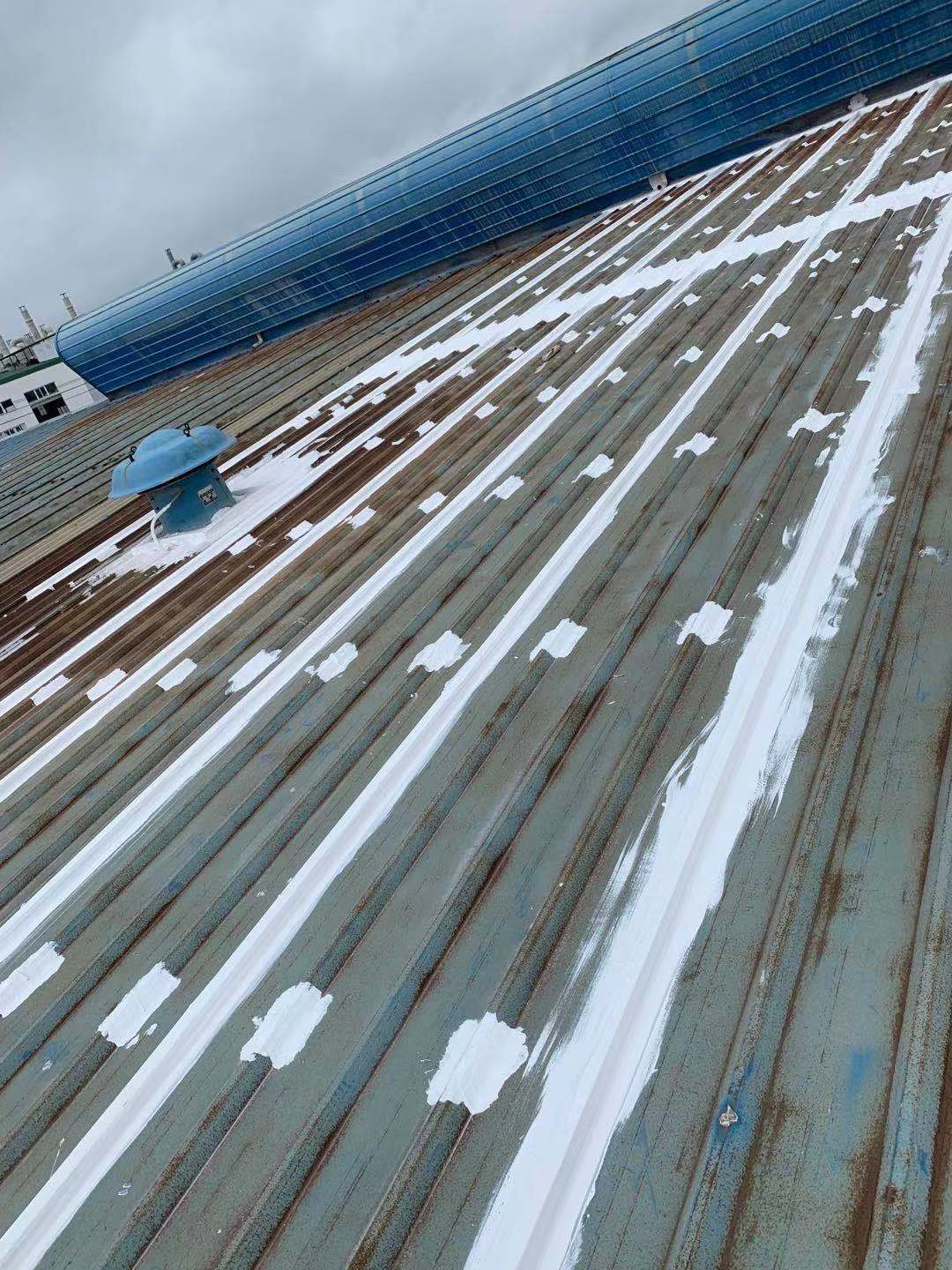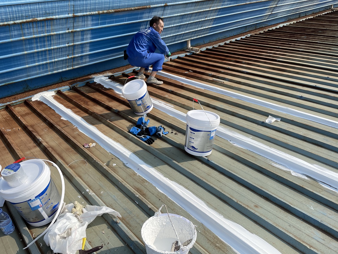 我公司采取的方案是,用SYR金屬屋面專用方式涂料配合縫織聚酯布一布三涂的方式對彩鋼頂的彩鋼搭接縫以及螺絲釘進行防水密封處理