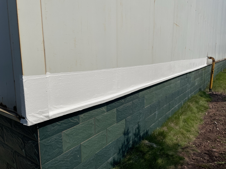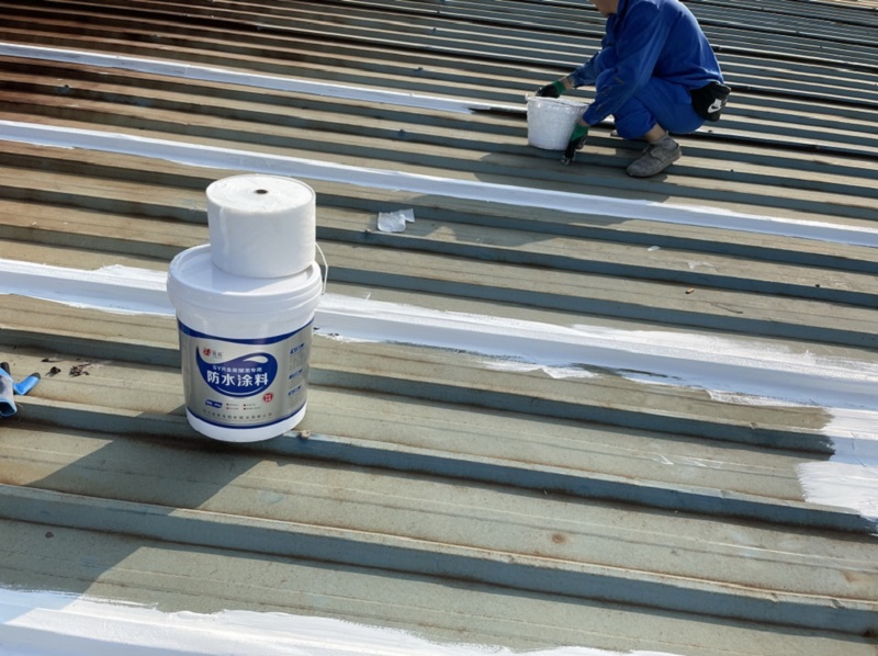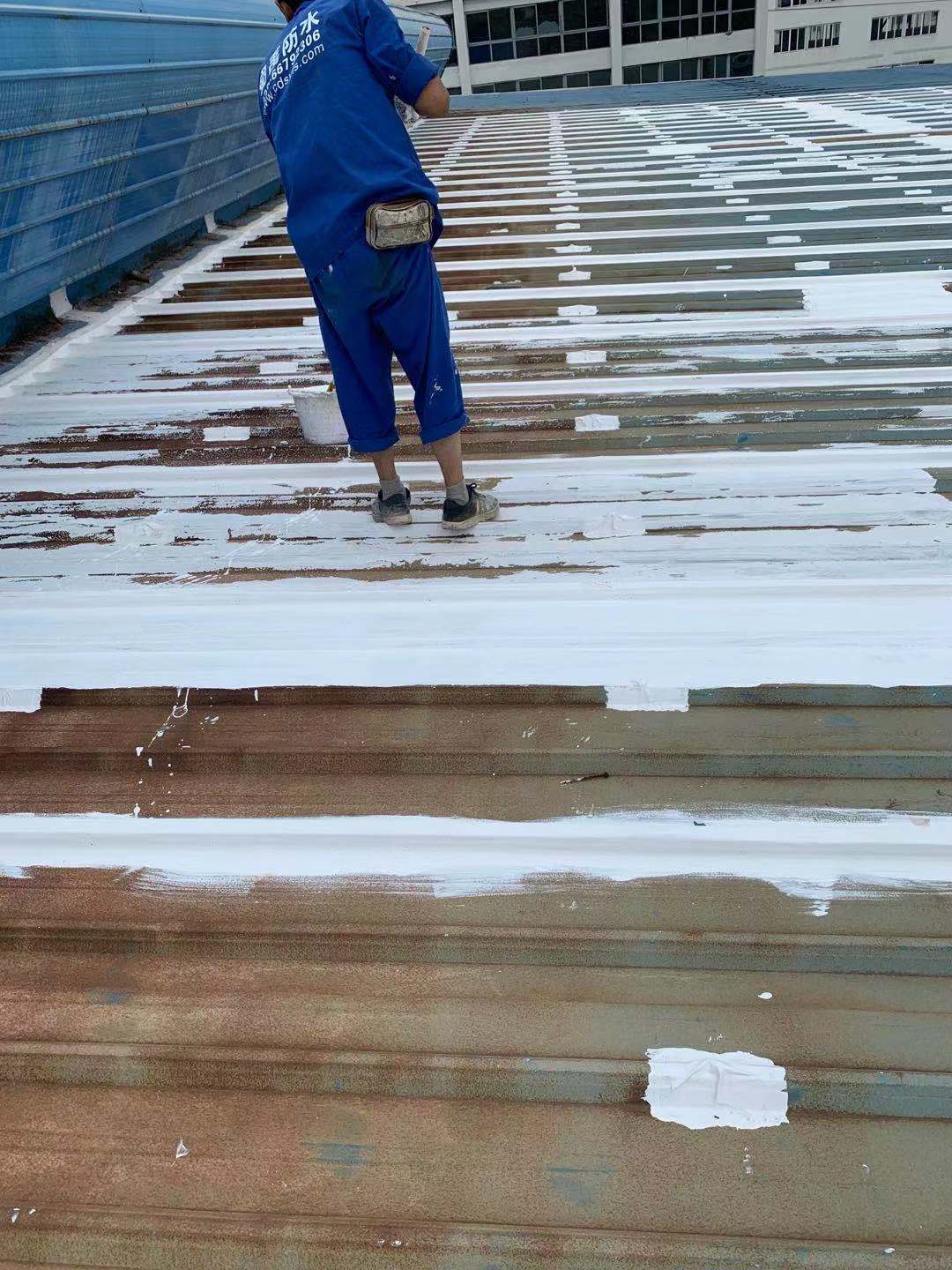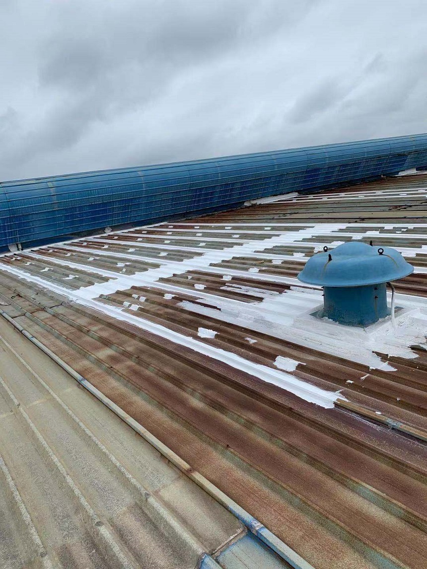 我公司采取的方案是,用SYR金屬屋面專用方式涂料配合縫織聚酯布一布三涂的方式對彩鋼頂的彩鋼搭接縫以及螺絲釘進行防水密封處理