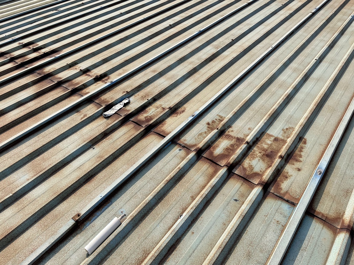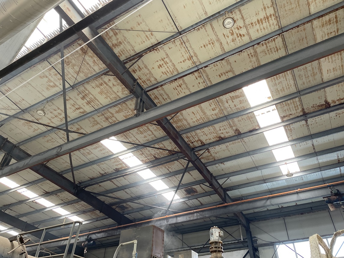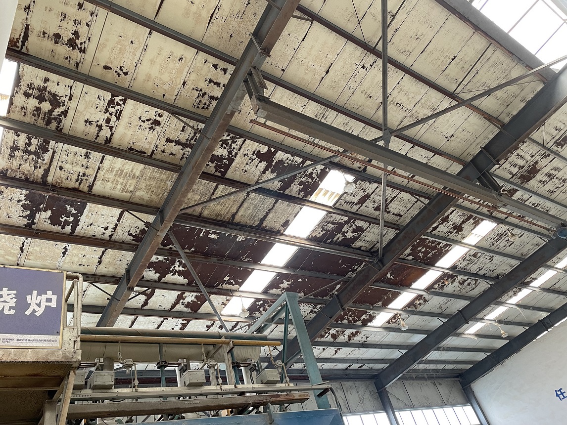 我公司2021年9月施工的位于重慶市潼南區田家工業園的重慶遠達催化劑綜合利用有限公司彩鋼頂防水,此廠房內為生產催化的車間,氣體具有一定的腐蝕性,導致廠房的彩鋼頂出現了一些銹蝕,彩鋼頂銹蝕情況: