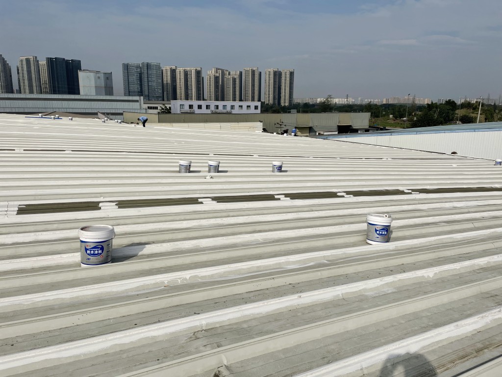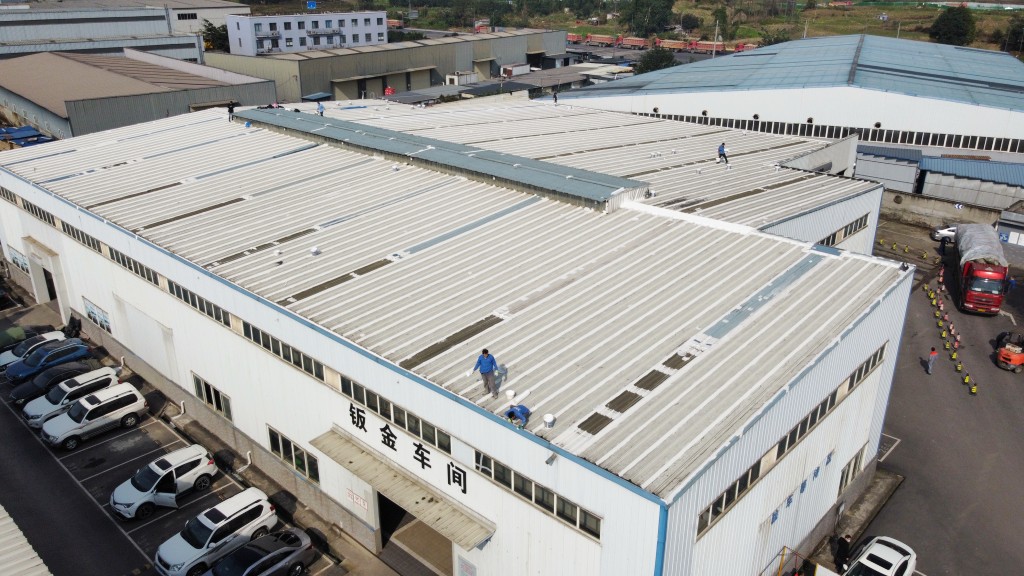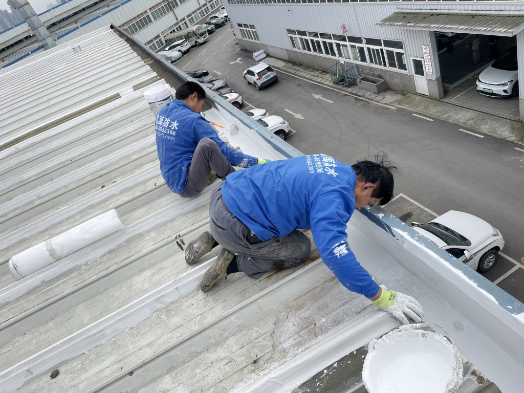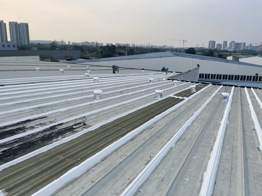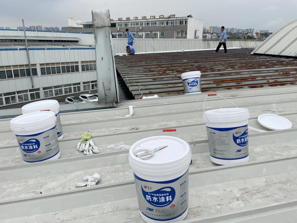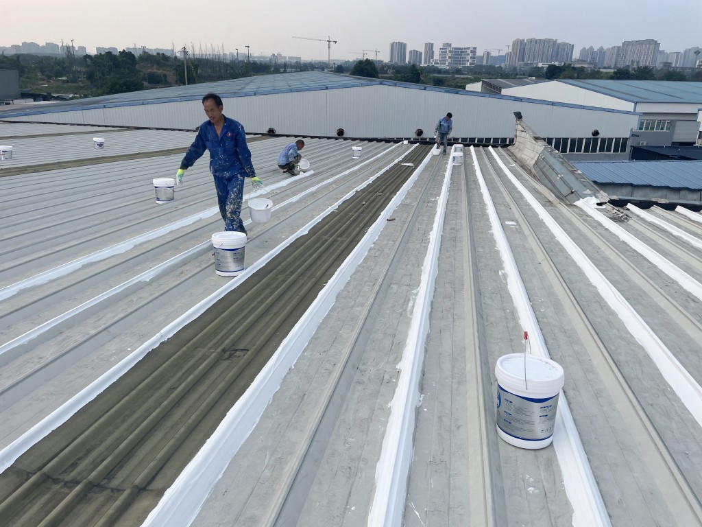 啟陽汽車華陽園區(qū)豐田鈑金車間與美容區(qū)及洗車區(qū)彩鋼頂防水工程由成都蜀禹建筑防水工程有限責(zé)任公司2021年8月進(jìn)行施工,廠房為鋼結(jié)構(gòu)的彩鋼頂,彩鋼頂漏水點(diǎn)位較多,并且豐田接車雨棚位置一塊區(qū)域彩鋼頂表面生銹了,先針對(duì)彩鋼頂進(jìn)行防水處理之后此處還對(duì)彩鋼表面滿涂SYR金屬屋面防水系統(tǒng)進(jìn)行防銹施工。此次針對(duì)此廠房頂部采用蜀禹SYR金屬屋面專用防水涂料配合專用縫織聚酯布進(jìn)行施工處理,處理后經(jīng)多次下雨檢驗(yàn)驗(yàn)收合格。