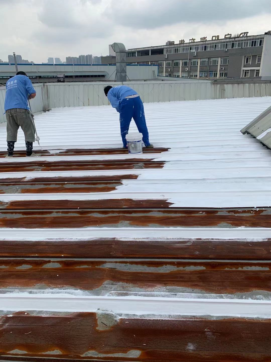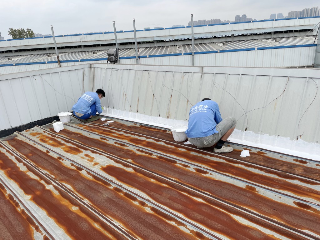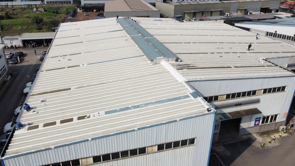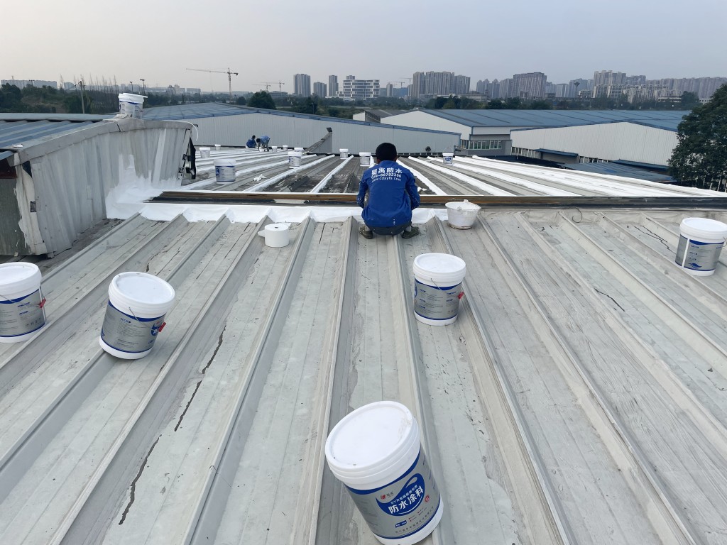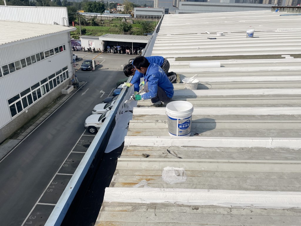 啟陽汽車華陽園區(qū)豐田鈑金車間與美容區(qū)及洗車區(qū)彩鋼頂防水工程由成都蜀禹建筑防水工程有限責(zé)任公司2021年8月進(jìn)行施工,廠房為鋼結(jié)構(gòu)的彩鋼頂,彩鋼頂漏水點(diǎn)位較多,并且豐田接車雨棚位置一塊區(qū)域彩鋼頂表面生銹了,先針對(duì)彩鋼頂進(jìn)行防水處理之后此處還對(duì)彩鋼表面滿涂SYR金屬屋面防水系統(tǒng)進(jìn)行防銹施工。此次針對(duì)此廠房頂部采用蜀禹SYR金屬屋面專用防水涂料配合專用縫織聚酯布進(jìn)行施工處理,處理后經(jīng)多次下雨檢驗(yàn)驗(yàn)收合格。