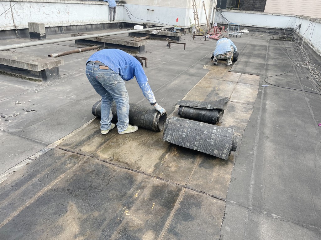 我公司采取的施工方案為:先將地面原有改性瀝青防水卷材清理掉,然后在地面及墻面滿鋪一層濕鋪防水卷材(濕鋪防水卷材可避免水在防水卷材底下到處竄的情況),防水卷材施工后在表面做一層砂漿保護(hù)層蓋住防水卷材,讓防水卷材免受紫外線照射,延長(zhǎng)防水卷材壽命,最后將施工產(chǎn)生的建渣搬運(yùn)下樓并清運(yùn)出場(chǎng)。