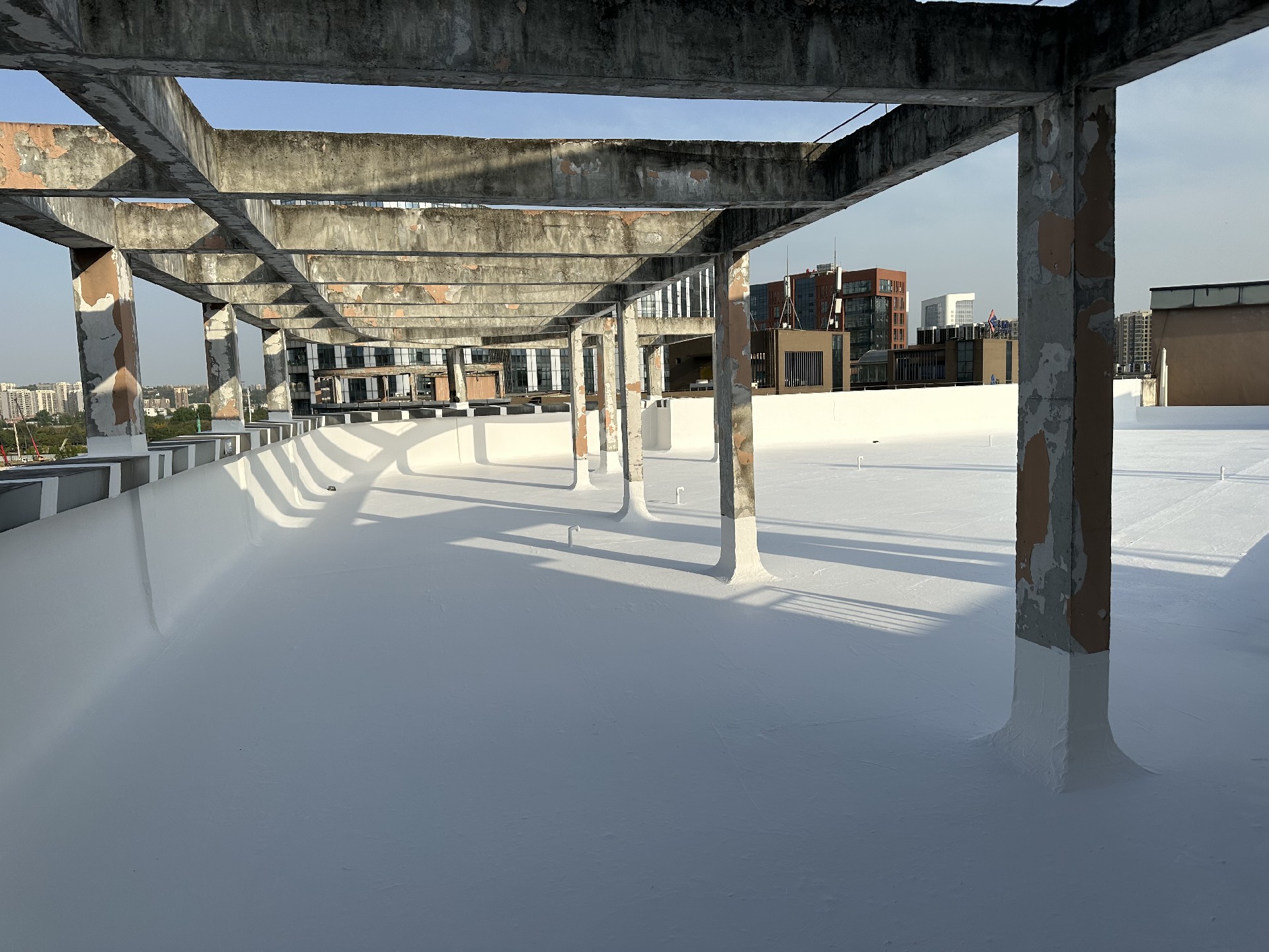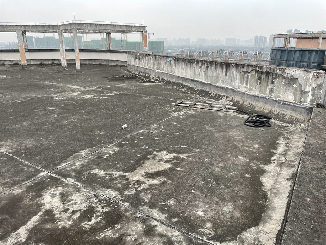 屋頂未施工之前,屋頂表面的保護(hù)層已經(jīng)翻砂起殼,個(gè)別地方鋼筋都已經(jīng)露出