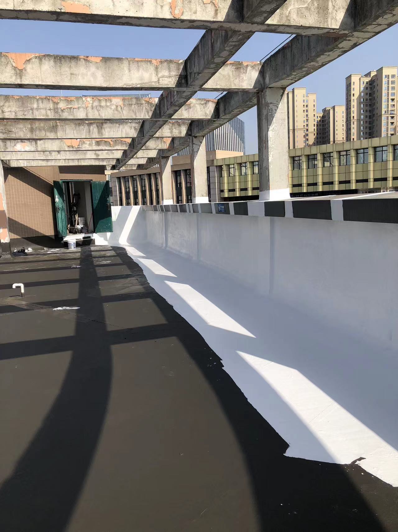 我公司現(xiàn)場(chǎng)施工工藝流程為:先將屋頂基層起殼易脫落的清理掉,破損部位水泥砂漿局部修補(bǔ),然后基層表面滿涂刷混凝土液體硬化劑進(jìn)行基層固化處理,這樣處理的好處是,后面做的防水層能夠與基層牢牢的粘結(jié)在一起;待混凝土液體硬化劑固化之后,屋頂?shù)牡孛婕皦γ嫒繚M涂刷蜀禹Ⅰ型聚合物水泥防水涂料然后滿鋪貼專(zhuān)用的縫織聚酯布再涂刷蜀禹Ⅰ型聚合物水泥防水涂料,待干后表面涂刷蜀禹Ⅰ型聚合物水泥防水涂料,等待干后表面再涂刷兩道SYR金屬屋面防水涂料涂層。施工完畢之后,等待施工的防水涂層干透之后,屋頂做閉水試驗(yàn)一星期后不漏水驗(yàn)收合格之后交驗(yàn)。
