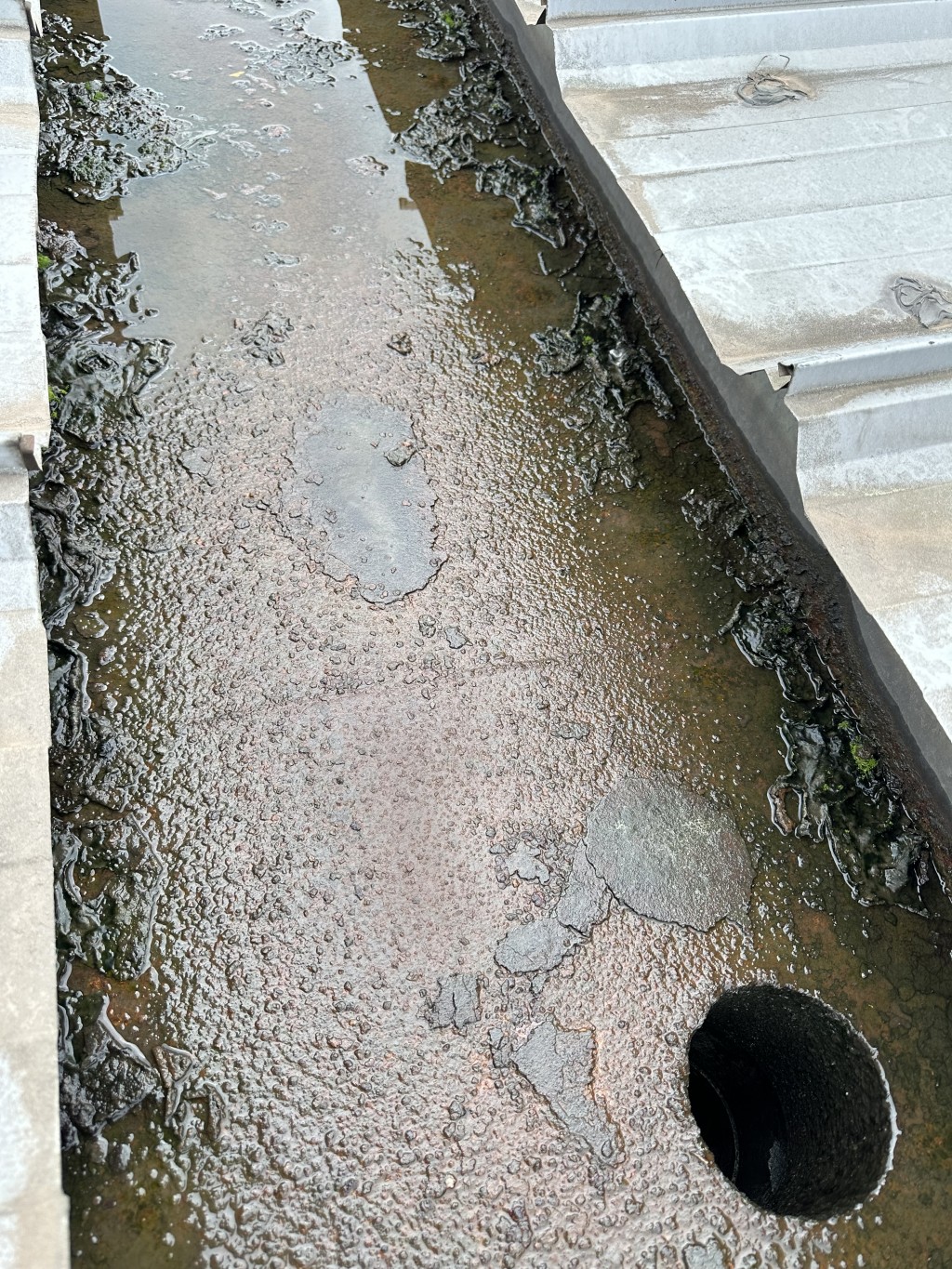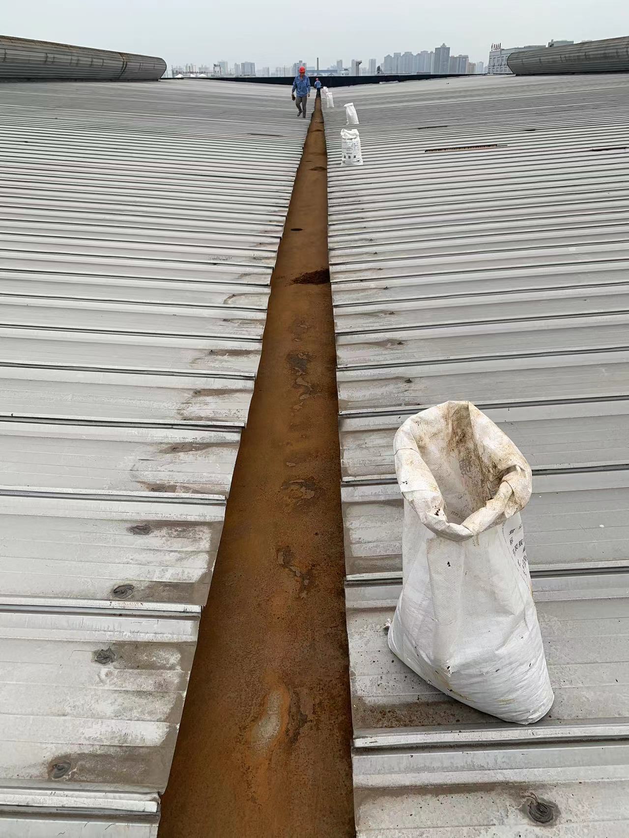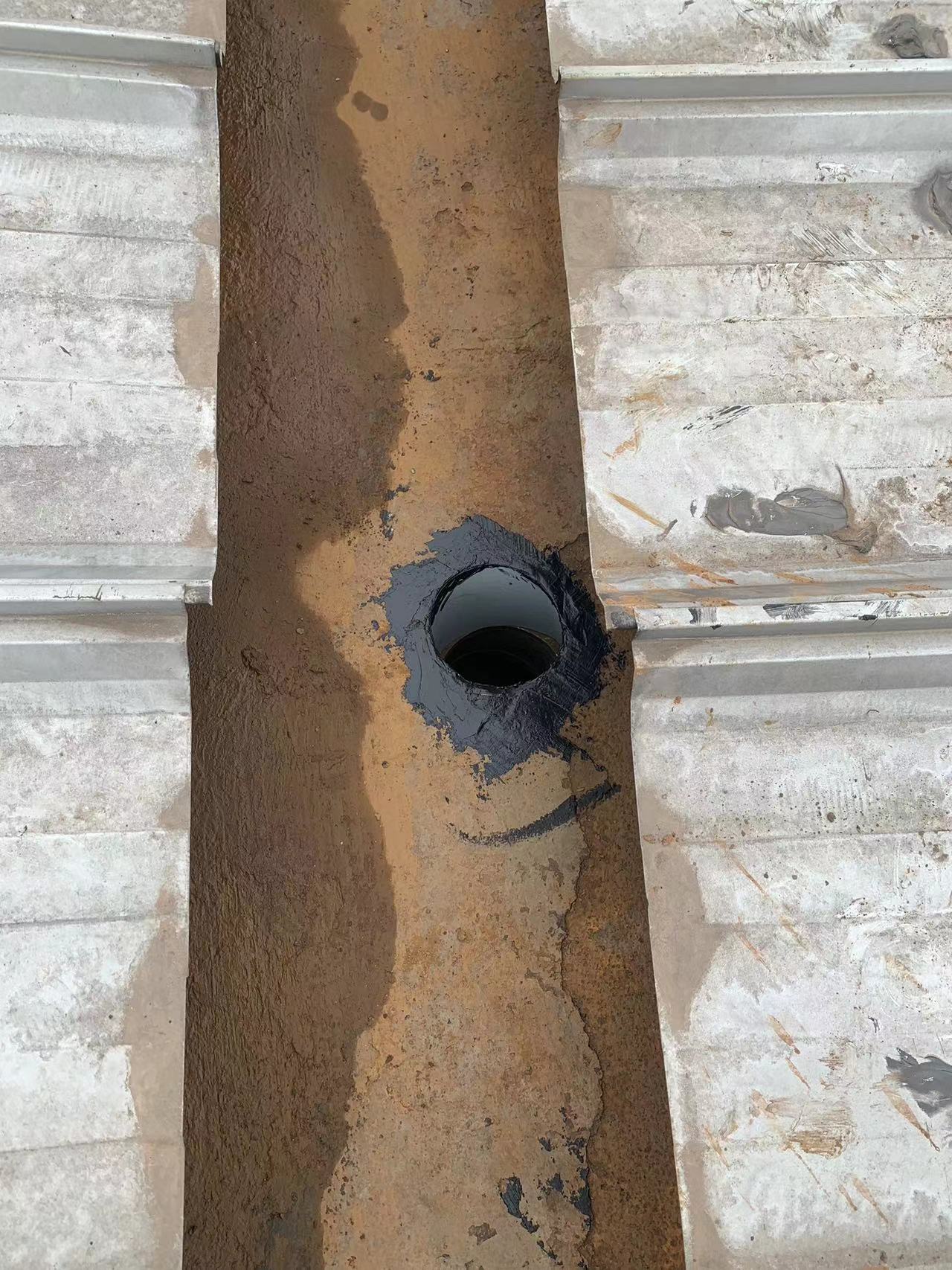 該廠房的彩鋼頂天溝在長期受到酸雨侵蝕下,天溝內個別下水管口銹蝕爛掉,導致雨水在降雨時從漏斗旁滴落,造成下水管周邊漏雨。同時,天溝內部的鐵板也出現了嚴重的銹蝕現象,已經出現起殼脫層,如果不及時處理,天溝可能會銹蝕穿孔,導致漏水,對廠房的生產設備及安全生產構成威脅。