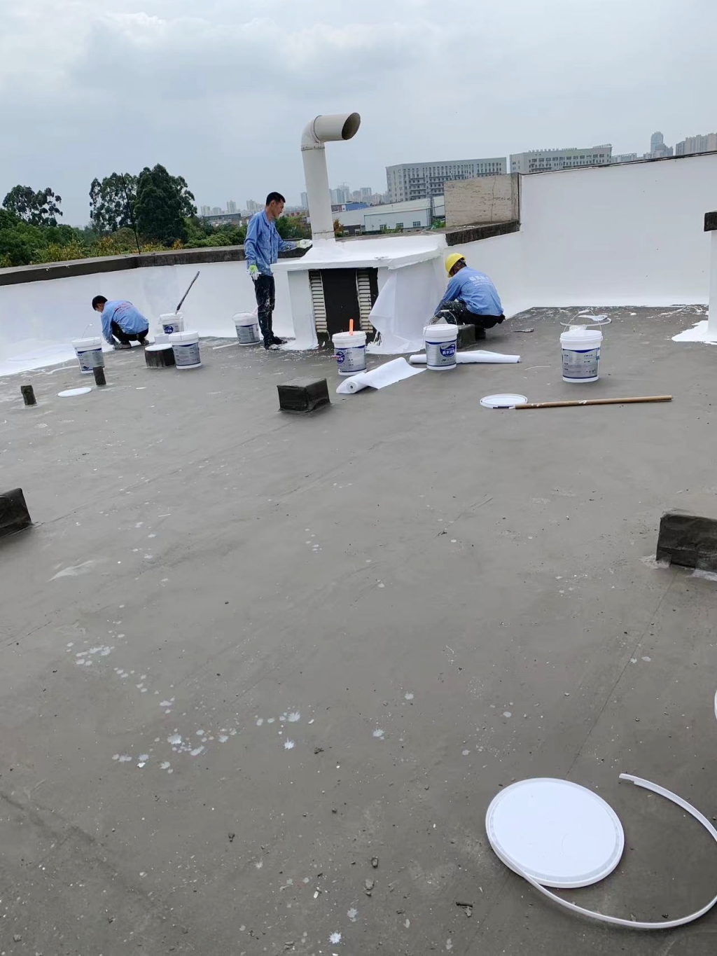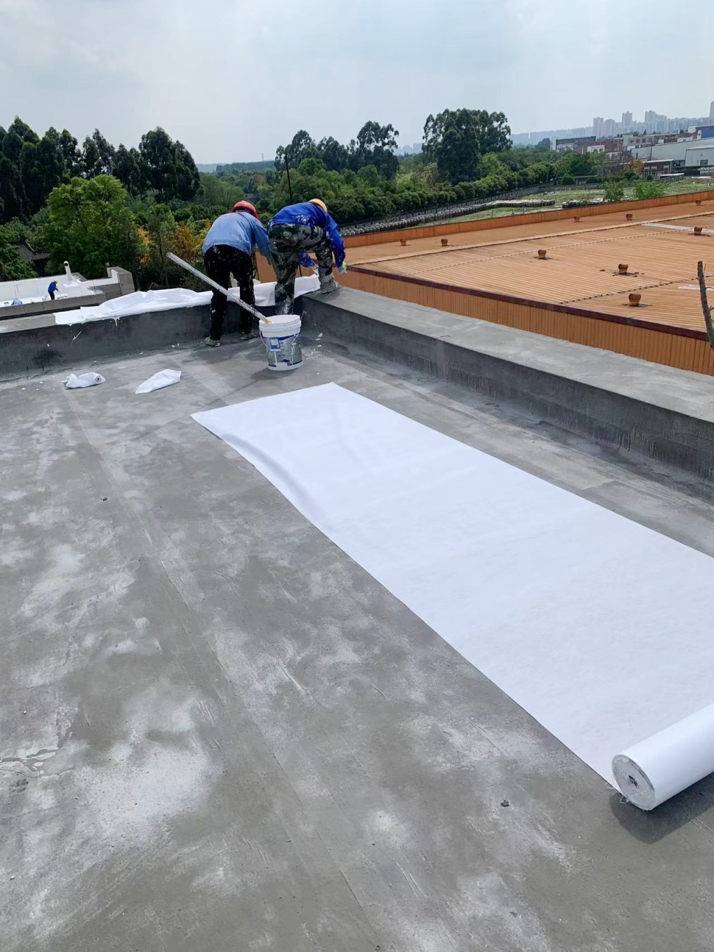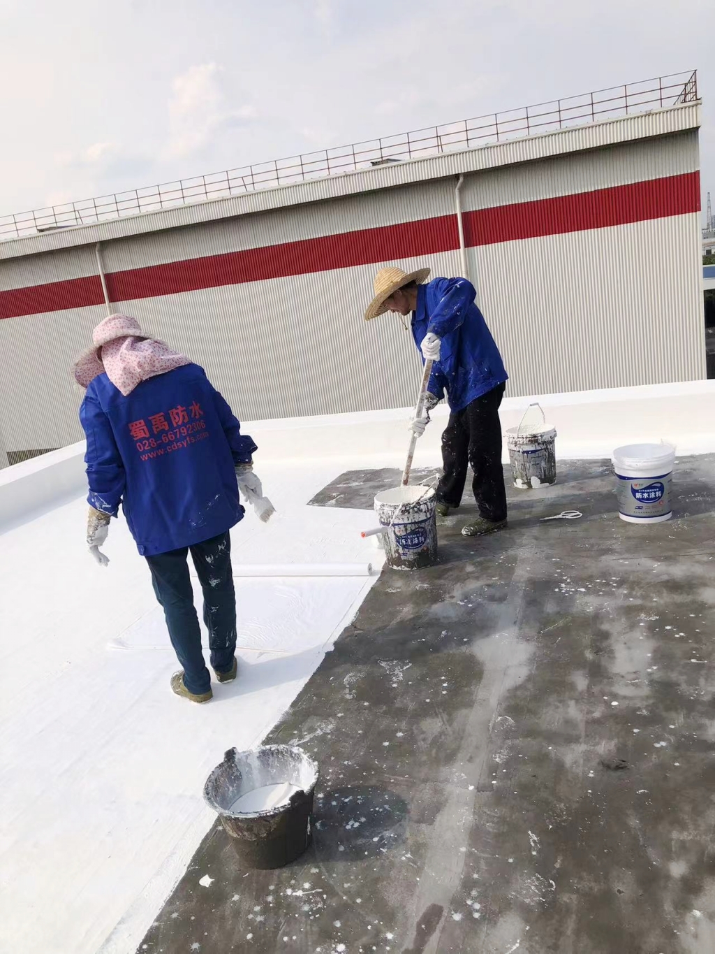 待第道一布兩涂防水涂料干燥后,我們涂刷SYR金屬屋面防水涂料,并再次鋪貼專用縫織聚酯布,表面再涂刷SYR金屬屋面防水涂料。這一材料的選用,不僅進一步提升了防水性能,同時也賦予了屋頂表面優異的反射隔熱效果。在涂刷完第二層SYR金屬屋面防水涂料后,我們靜待其干燥,隨后又涂刷了一層,確保防水系統達到更佳效果。