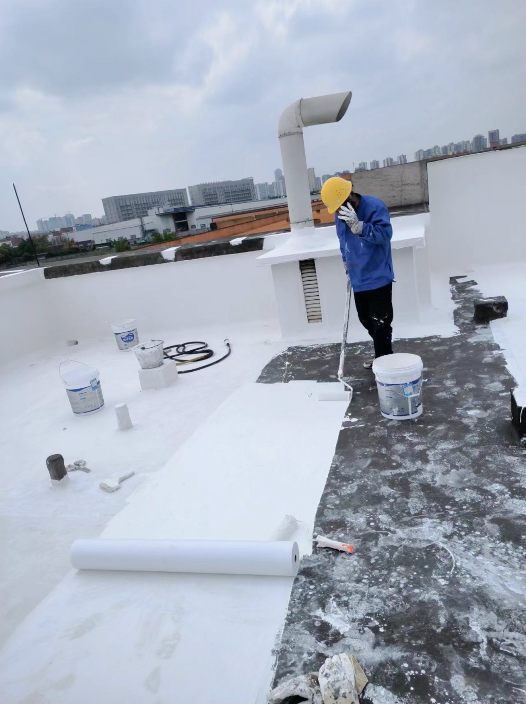 面對這一挑戰,我們采用了先進的SYR外露型無縫防水系統。在項目開始之初,我們注意到原屋頂表面覆蓋的是已經老化開裂的改性瀝青防水卷材。為了確保防水效果的長久性和可靠性,我們決定先將這些老舊的防水卷材徹底清除,并對基層表面進行細致清理,確保每一寸都干凈整潔,為后續的防水工作打下堅實基礎。
