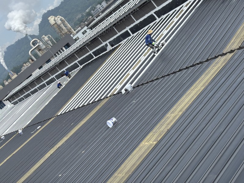 整體防腐翻新:完成關(guān)鍵部位處理后,對(duì)整個(gè)彩鋼頂屋面滿噴涂第一遍 SYR 金屬屋面專用防水涂料,實(shí)現(xiàn)全面防腐;待涂層干透后,再噴涂第二遍防水涂料,進(jìn)一步提升屋面的抗老化、抗風(fēng)雨侵蝕能力。